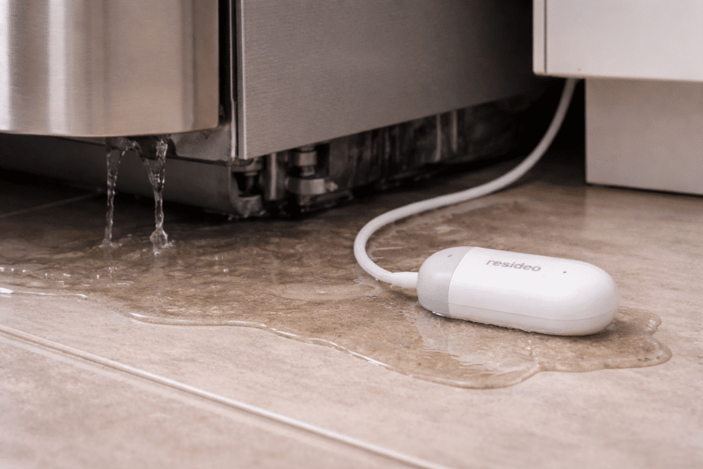 But beneath the dishwasher sits a Resideo L2 leak sensor. The sensor detects moisture immediately. That single event triggers a cascade of automated actions through the RemoteLock ecosystem.